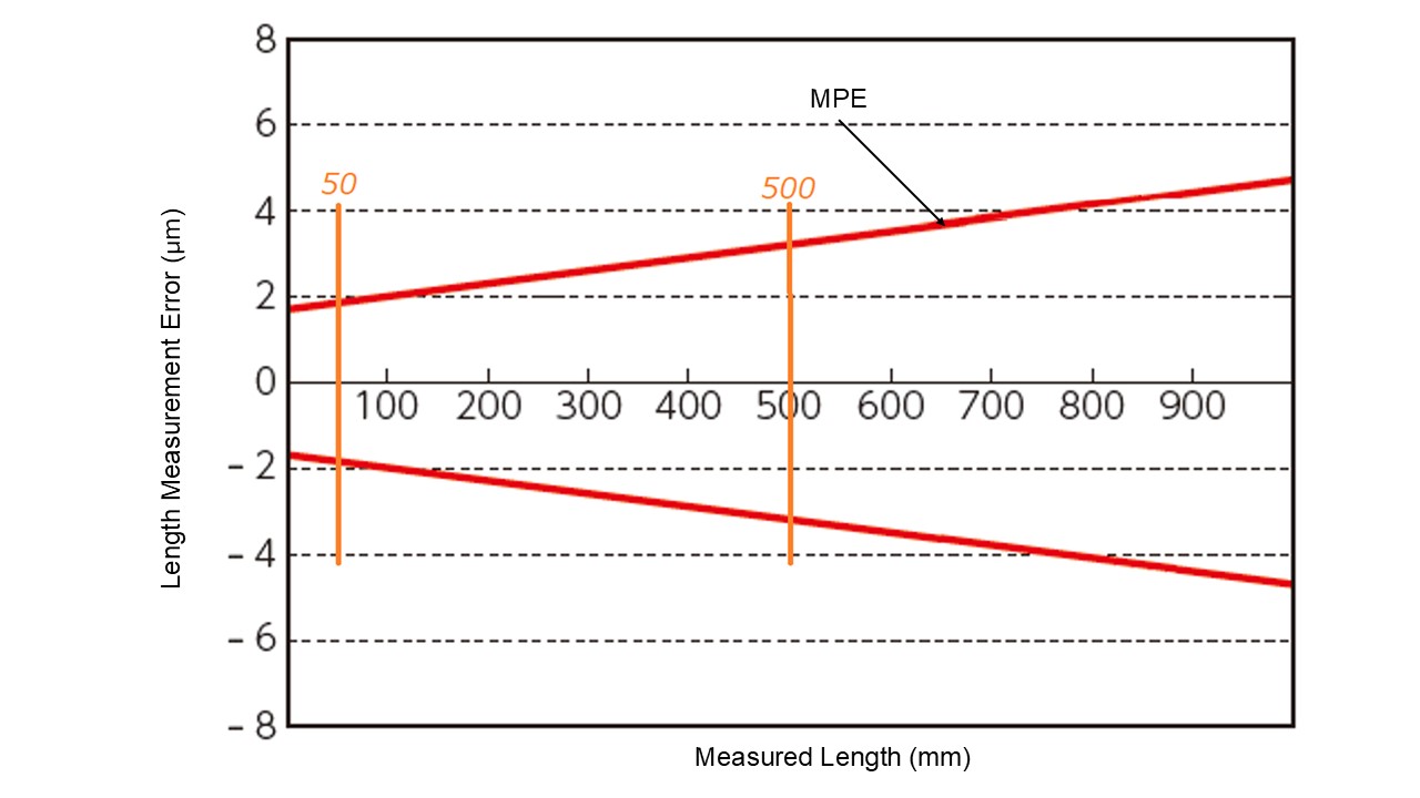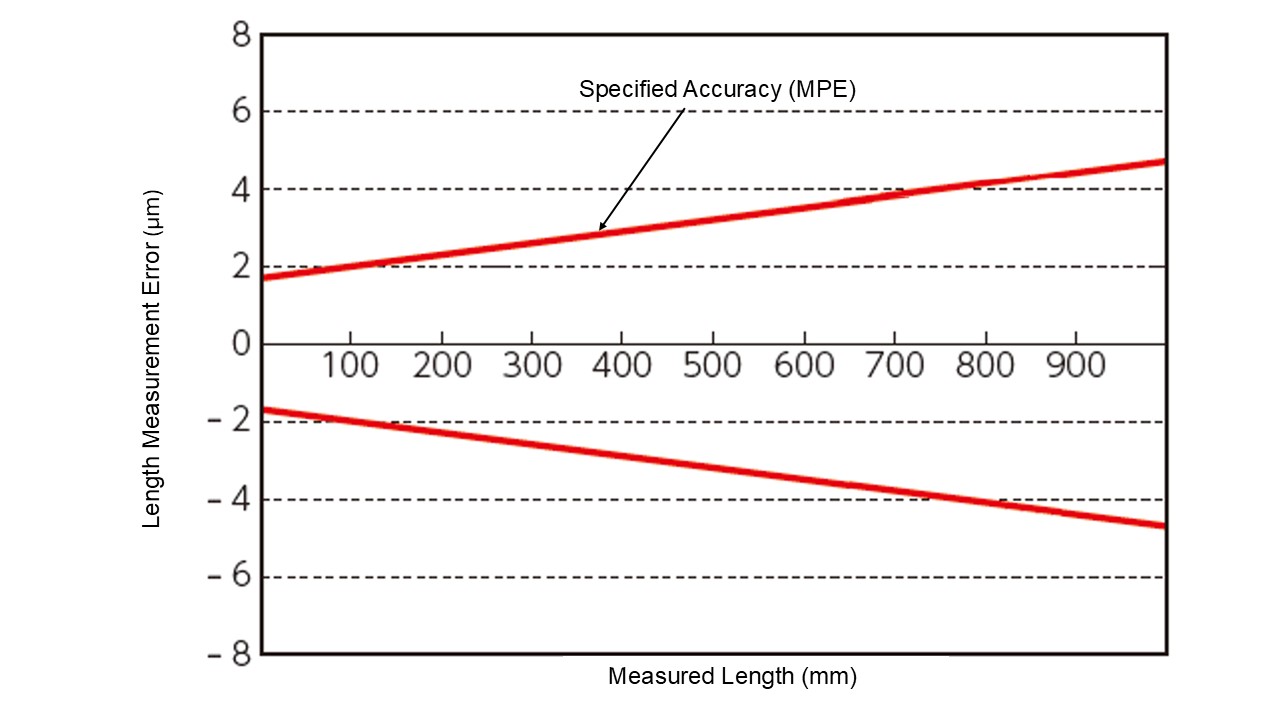 Accuracy specifications sometimes use formulas. For example, an accuracy specification for the length measurement error for some measuring instrument, might involve using a maximum permissible error (MPE) formula that looks like the following: MPE = 1.7+3L/1000 μm L = measured length (mm) The MPE is the specified limit of error, or accuracy, across the instrument measuring range as show in Figure 1. |