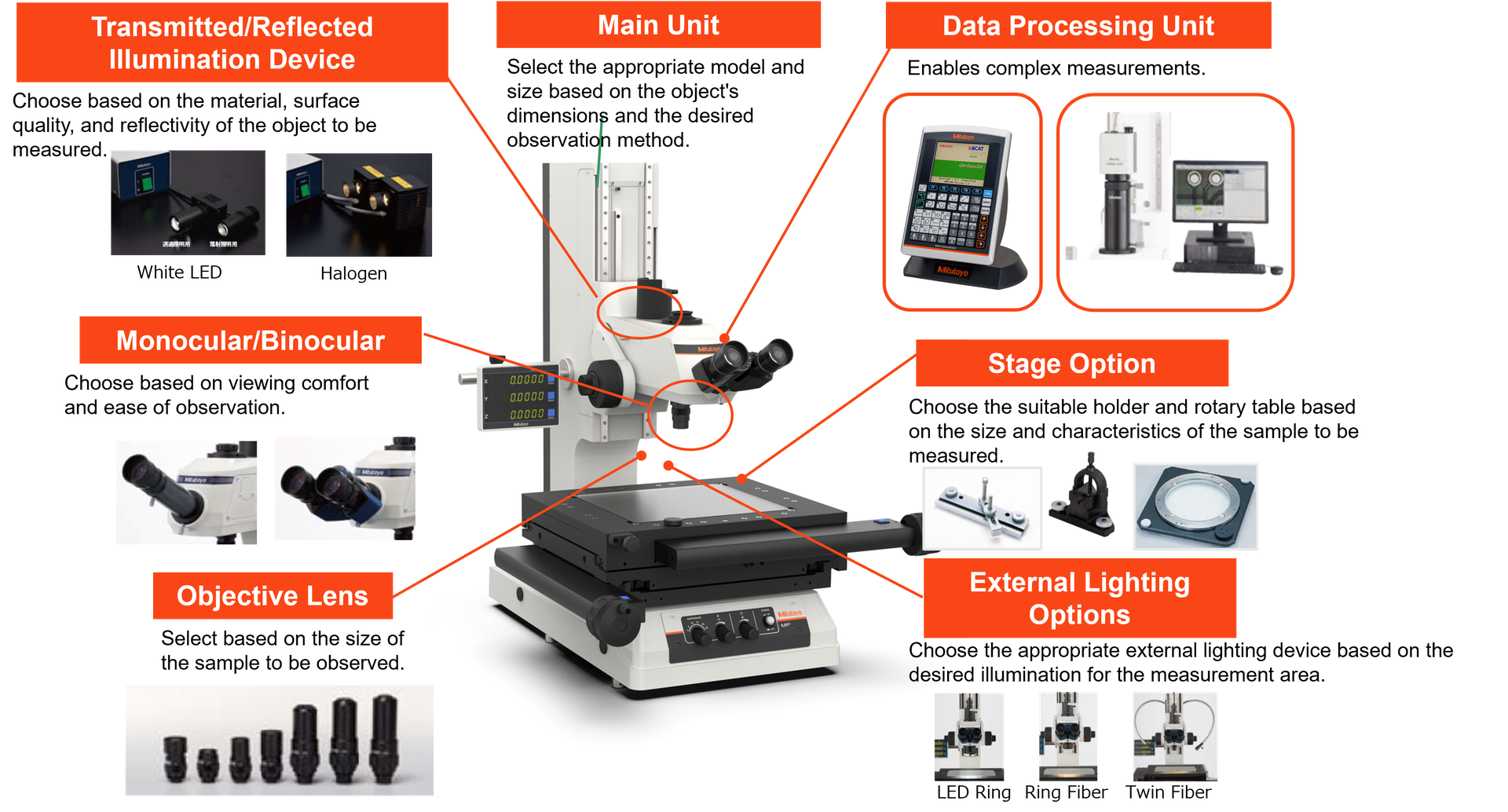 An optical instrument magnifies small objects using an optical lens, allowing the magnified image to be observed through a circular screen, eyepiece, or digital display. These instruments are designed for the inspection, measurement, and detailed analysis of small features or components and include systems such as profile projectors, optical comparators, and microscopes.