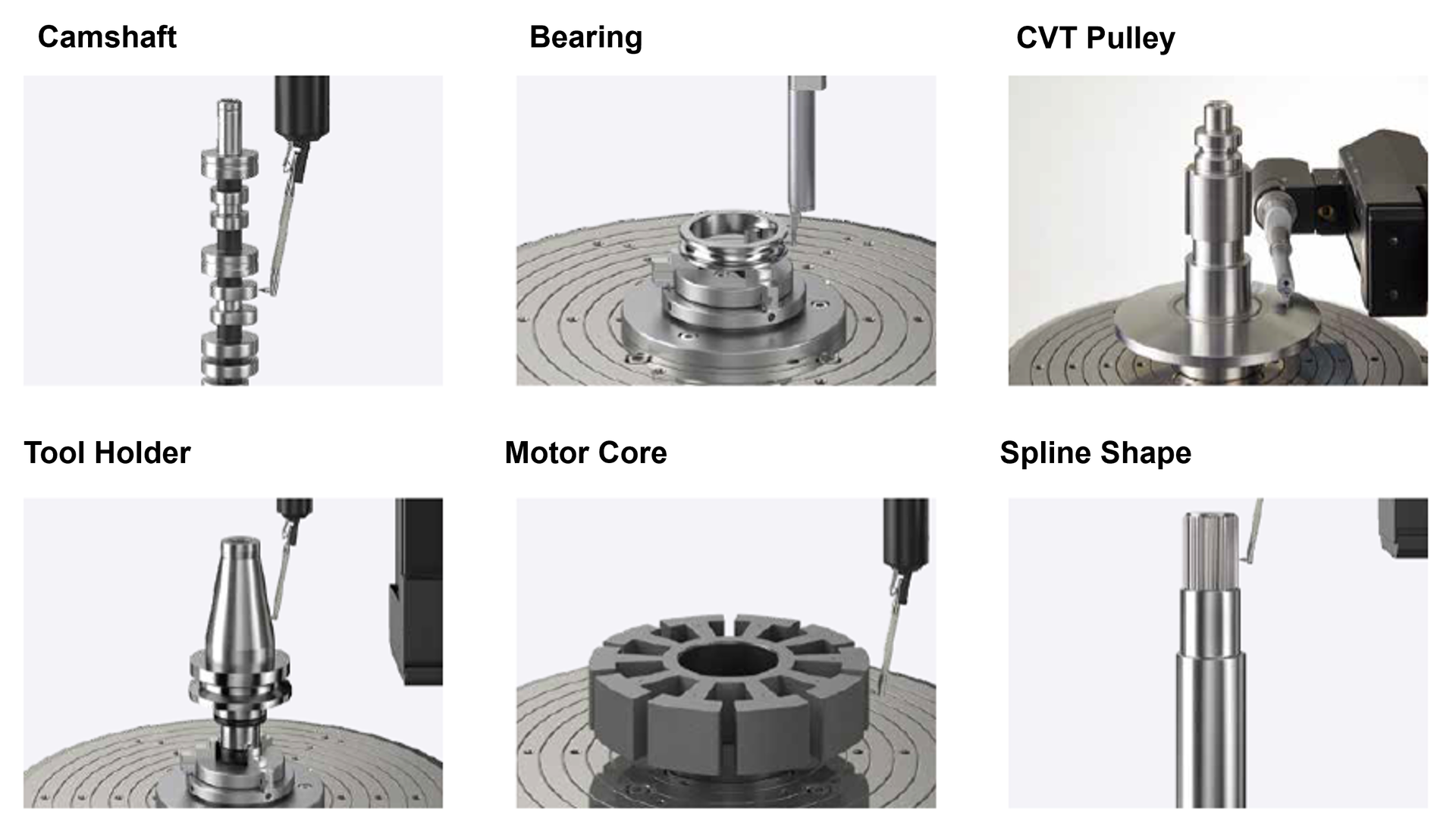 The ROUNDTRACER EXTREME supports the measurement of a wide range of components, including xEV drive motor parts, camshafts, bearings, cylinders, CVT pulleys, tool holders, and spline shapes.