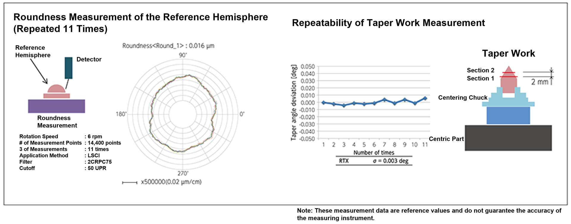 Even when measuring tapered objects, the machine achieves an impressive standard deviation of σ0.003°, showcasing exceptional repeatability. Reliable and consistent measurement results are essential for streamlining prototype development, reducing lead times, and maintaining accuracy throughout the process.